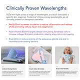 Near-Infrared Lights (850nm): Penetrating into the deeper layers of the skin, near-infrared light works to stimulate fibroblast activity to strengthen the skin and when combined with blue or red light aids in reducing any inflammation and providing advanced skin rejuvenation.