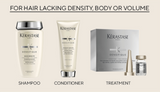 Hair loss and loss of density are different hair concerns that Kérastase treats with a dedicated ritual called Densifique. The Densifique Routine features products with densifying technologies including hyularonic acid and Intra-Cyclane to plump, hydrate and strengthen the hair.