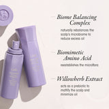 - Biome Balancing Complex: (Rosebay Extract and Green Marine Algae) naturally regulates and rebalances the scalp’s biome to reduce excess sebum and extend time between washes.