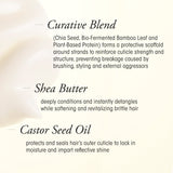 - Curative Blend (Chia Seed, Bio-Fermented Bamboo Leaf and Plant-Based Protein) penetrates the hair cortex to build strength from within while forming a protective scaffold around strands to reinforce cuticle strength and structure and prevent breakage caused by brushing, styling and external aggressors.